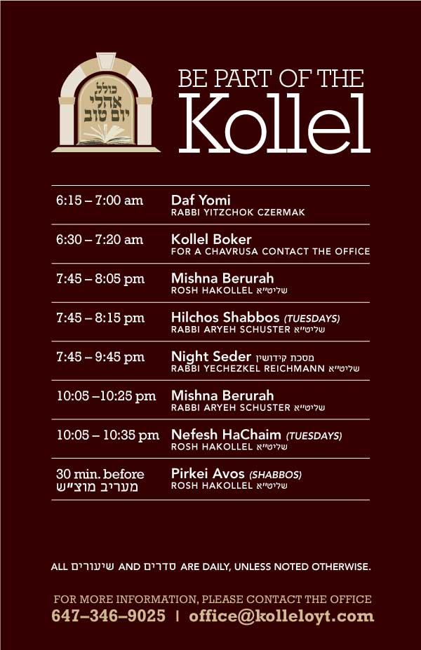 Kollel Oholei Yom Tov continues to be a welcoming hub of Torah and Tefillah for many of our community’s young men and their families. Entering our seventh year, we look to welcome additional supporters of Torah to the helm of this vital establishment. Please seize the opportunity to become a partner in perpetuating this magnificent centre of Torah in our city.